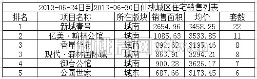 图一:上周(6.24~6.30)仙桃城区住宅销售排行榜TOP5