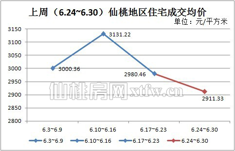 上周(6.24~6.30)仙桃地区(包含部分乡镇楼盘)的住宅成交均价相比上上周变化不大,略微有些下降,为2911.33元/平方米。总体来看的话,仙桃地区住宅的均价还是维持在3000元/平方米左右。