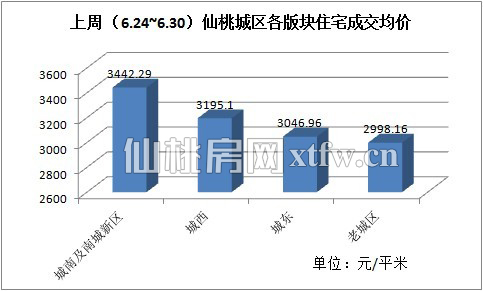 图三:上周(6.24~6.30)仙桃城区各版块住宅成交均价(元/平米)