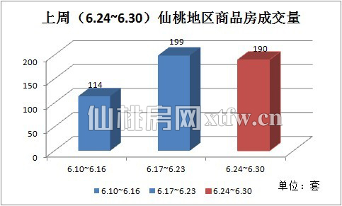 相比上上周,上周(6.24~6.30)的销量稍稍减少了些,这周销售商品房190套。