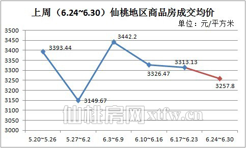 上周(6.24~6.30)商品房的成交均价与住宅成交均价一样,变化不大,稍稍有些下降。上周(6.17~6.23)仙桃地区商品房成交均价为3257.8元/平方米。