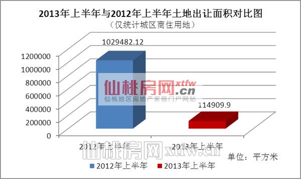 2013年上半年土地出让无论是从成交宗数上还是成交面积、成交金额上都明显减少。2013年上半年仙桃城区商住用地出让11宗,同比2012年减少47.62%。2013年上半年仙桃城区商住用地出让面积为11万余方,为2012年出让来量的九分之一。而2012年的土地出让金额也是2013年的五倍多。