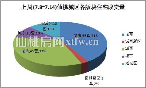 仙桃城区各版块的成交量依然维持以往的销售状态,城南成交56套,占比41%,城西版块销量为45套,占比33%,成为上周住宅成交量的主力军。老城区版块销售住宅18套,占比13%,城东版块销售13套,占比10%,南城新区销量较少,在城区各版块的占比也较小。