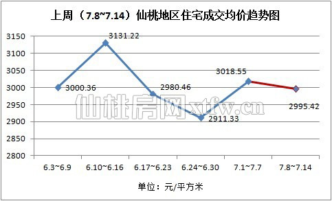 上周(7.8~7.14)仙桃地区(包含部分乡镇楼盘)的住宅成交均价相比上上周变化不大,略微有下降,为2995.42元/平方米。总体来看的话,仙桃地区住宅的均价还是维持在3000元/平方米左右。