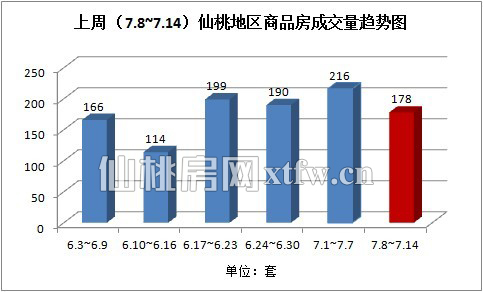 环比七月周,上周(7.8~7.14)的销量有所下降,为仙桃地区商品房成交量为178套。