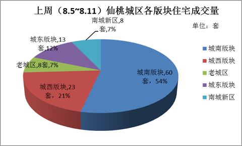 据统计,上周(8.5~8.11)仙桃住宅各区域成交:城南版块(60套)、城西版块(23套)、老城区(8套)、城东版块(13套)、南城新区(8套)。 上周依然是城南版块独撑半边天,销售套数占比54%,城西版块占比21%位列二。城东版块成交套数较前一周差异不大,但老城区与南城新区成交量均有所下滑。