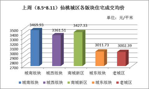 图三:上周(8.5~8.11)仙桃城区各版块住宅成交均价(元/平米)