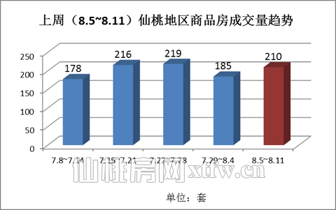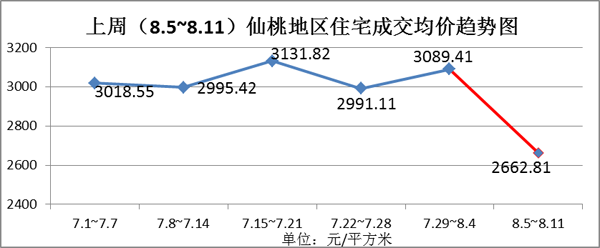 上周(8.5-8.11)仙桃地区(包含乡镇楼盘)的住宅成交均价较前几周大幅下降至2662.81元/平米,主要是由于上周乡镇楼盘,而乡镇楼盘的均价大都在1500元/平米左右,均价较低,因而影响了上周总体的住宅成交均价。