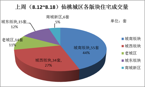 上周各版块成交无太大异常,城南版块成交55套,占比44%,依然位列各版块成交之,城西版块成交34套,环比增长47.82%,虽然较前一周成交量变化波动较大,但对比整月城西版块的成交量,并无反常。