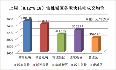 图三:上周(8.12~8.18)仙桃城区各版块住宅成交均价(元/平米)