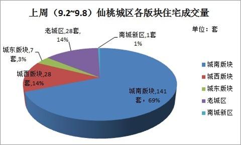 步入“金九银十”,上周(9.2~9.8)仙桃市城区住宅共成交205套,环比增长64%,其中城南版块上周成交141套,占比69%,但其他版块销售并无别明显的增长,城西版块与老城区均成交28套,各占比14%,城东版块成交7套,而南城新区上周成交1套。