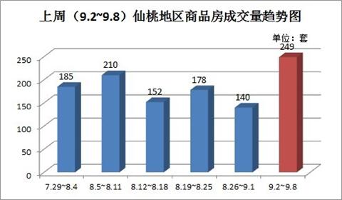 上周(9.2~9.8)由于城南部分楼盘住宅,仙桃上周商品房成交249套,环比增长77.8%。打响了“金九银十”的枪。