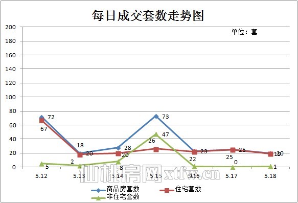 上周(5.12~5.18)商品房共成交261套,其中住宅197套,非住宅64套,每日住宅成交量走势基本稳定。平均每日销售28套。