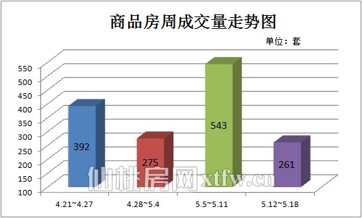 上周(5.12~5.18)商品房成交量为261套,相比前几周都有所下降。