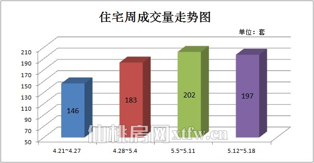 上周(5.12~5.18)住宅总成交量为197套,与前几周相比,成交量走势基本平稳。