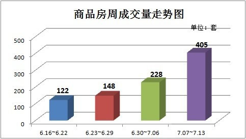 上周(7.7~7.13)商品房成交405套,受非住宅成交量上涨影响,上周的商品房成交量环比上上周涨幅约77.63%。