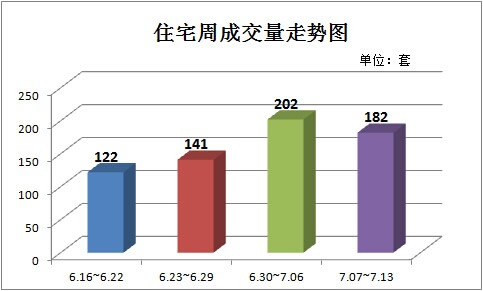 上周(7.7~7.13)住宅周成交量182套,与前一周相比略有下降,但是跌幅不大,环比上上周跌幅约为9.9%。但与前几周对比而言,上周住宅成交量总体而言还是比较可观的。