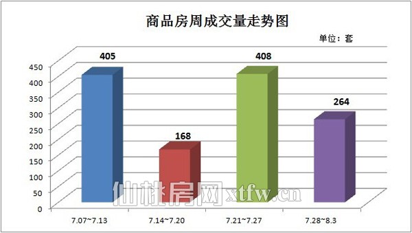 从上周(7.28~8.3)商品房成交量走势图来看,上周的商品房成交264套,环比上上周的商品房成交408套有所下降,降幅约为35.29%。