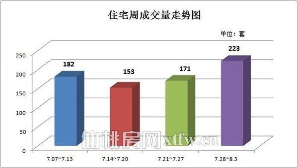从上周(7.28~8.3)住宅成交量走势图来看,上周的住宅成交量为223套,和前几周相比取得了不错的成绩,环比上上周住宅成交量171套有较大的增长,涨幅约为30.41%。在上周中,位于城南版块的仙桃·