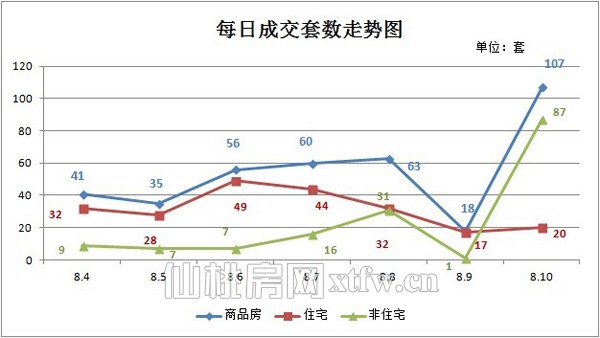 从上周(8.4-8.10)每日成交套数走势图来看,商品房的每日成交套数波动较大,整体来看销量较好,8月9日是这一周中销量的低点,当天商品房成交18套;8月10日达到这一周中成交套数的高峰,当天商品房成交107套,其中非住宅成交87套,其中文华·