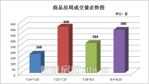 从上周(8.4-8.10)商品房周成交量走势图来看,上周的商品房成交总量为380套,环比上上周的264套有明显的增长,涨幅为43.94%。在上周(8.4-8.10)中,商品房周成交总量为380套,其中住宅成交量为222套,占商品房总成交量的58.42%;非住宅成交量为158套,占商品房总成交量的41.58%。
