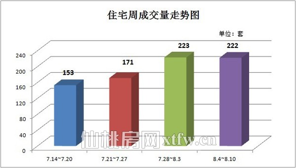 从上周(8.4-8.10)住宅周成交量走势图来看,上周的住宅成交总量为222套,和前几周相比取得不错的成绩,环比上上周的223套没有明显变化。其中元泰·未来城和现代·森林国际城、仙桃·