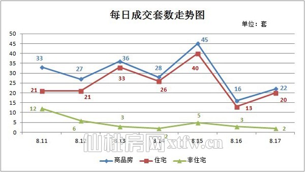 从上周(8.11-8.17)每日成交套数走势图来看,上周商品房的每日成交套数波动起伏较大,8月15日达到高峰,当天商品房成交45套,住宅成交21套,其中位于乡镇版块的