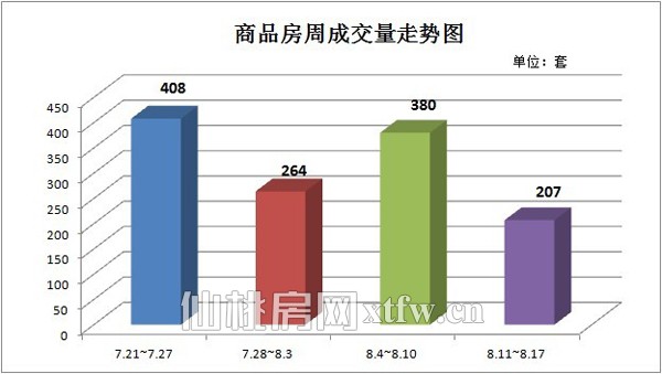 从上周(8.11-8.17)商品房周成交量走势图来看,上周的商品房成交总量为207套,环比上上周(8.4—8.10)的380套有明显的减少,降幅约为45.53%。在上周(8.11-8.17)中,住宅成交总量为174套,占商品房成交总量的约84.06%;非住宅成交总量为33套,占商品房成交总量的约15.94%。