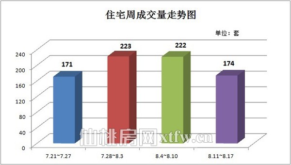从上周(8.11-8.17)住宅周成交量走势图来看,上周的住宅成交总量为174套,和前几周相比销量还不错,环比上上周(8.4—8.10)的222套有明显的减少,降幅约为21.62%。从上周的仙桃楼市住宅销售情况来看,位于乡镇版块的
