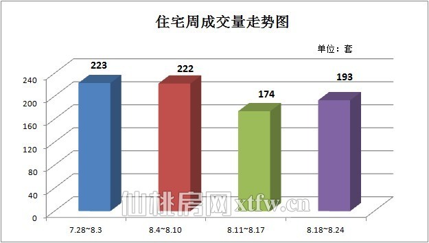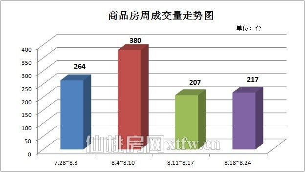 从上周(8.18-8.24)商品房周成交量走势图来看,上周(8.18-8.24)的商品房成交总量为217套,和这几周相比还不错。在上周(8.18-8.24)中,住宅成交总量为193套,占商品房成交总量的约88.94%;非住宅成交总量为24套,占商品房成交总量的约11.06%。