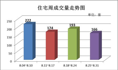 上周(8.25-8.31)是8月的后一周,也是8月住宅成交量低的一周。住宅周成交166套,环比下降13.98%,而住宅成交大户依然是城南版块,