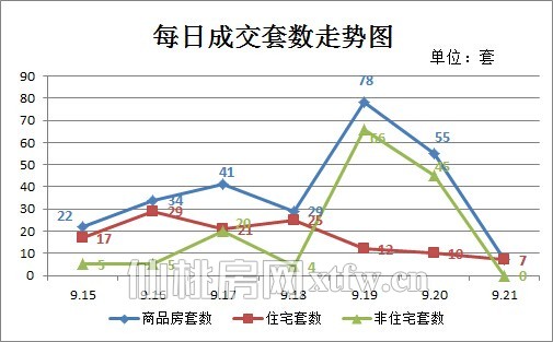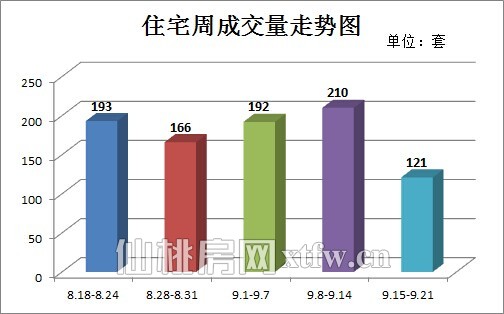上周(9.15-9.21)住宅成交121套,环比下降42.38%。从住宅周成交量走势图可以看出前几周住宅销量都是持续增长,而上周有大幅回落。相信也有不少购房者正期待着10月16日举办的六届房交会,因此迟迟不出手正在观望。