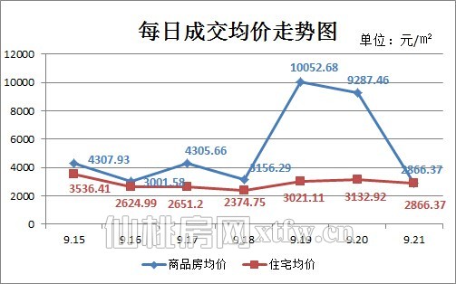 从上周(9.15-9.21)每日成交均价走势图来看,无论是住宅还是商品房的成交均价,起伏波动都比较大。9月18日住宅成交均价低,为2374.75元/平方米,当日乡镇项目