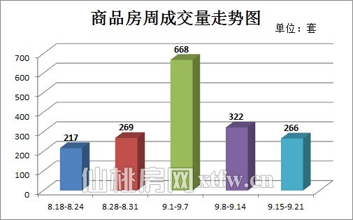 仙桃房网新数据统计:2014年9月15日至2014年9月21日仙桃楼市销售总交易记录为266套,成交面积21865.33㎡,成交金额132858146.9元,均价约6076.2元/㎡。其中住宅成交121套,成交面积为13120.39㎡,成交金额约36839396.33元,成交均价约2807.8元/㎡;非住宅销售145套,成交面积8744.94㎡,成交金额约96018750.57元,成交均价约10979.92元/㎡。(此数据供参考,请以官方发布数据为准。)