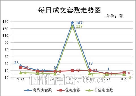 从上周(9.22-9.28)每日成交套数走势图上可以看出,除了9月25日非住宅成交出现大幅上涨外,其余6日的成交量都表现平平。尤其是,9月27日商品房成交1套,9月28日商品房销量为4套。销量反而不如工作日,这是近几周楼市成交量表现出的共性。