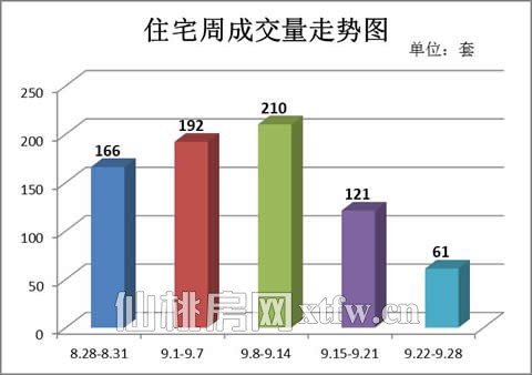 金九前两周成交量保持增长后,后两周的销量持续走低,上周住宅更是以61套的成交量创9月成交值低,上周为9月后一周,金九结束是传统的银十季,各家的促销优惠活动会持续加大,随着房企入市量的加大和为金九银十冲销量推出的各类优惠活动,希望房企为了冲刺年底销售业绩能为市场带来新一轮活力。