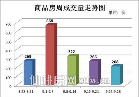 上周(9.22-9.28)商品房成交套数为208套,环比降幅为21.8%。对比整个金九,商品房销量在周达到668套的一个高峰,但接下来几周持续走低。尤其是步入金九下旬,后两周销量大幅下降,金九月恐难再出现成交高峰。接下来的十月除了有国庆小长假,以及10月16至22日即将举行的仙桃市六届住房交易会,加之十月也有不少楼盘推盘,希望能对十月楼市销量带来较大影响。
