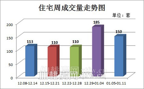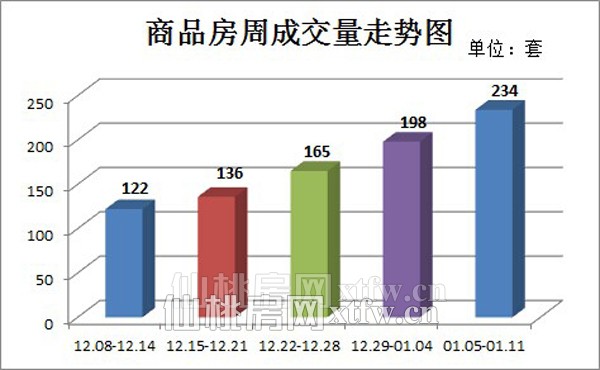 仙桃楼市上周(01.05-01.11)商品房成交量是234套,其中住宅成交150套,非住宅成交84套。商品房成交量环比增长18%,其中非住宅成交量增加了5.46倍,增幅十分显著。从近几周的走势来看,成交量在持续回升,究其原因主要有回家置业潮即将到来,目前市场利好政策较多以及年底楼盘以价换量。