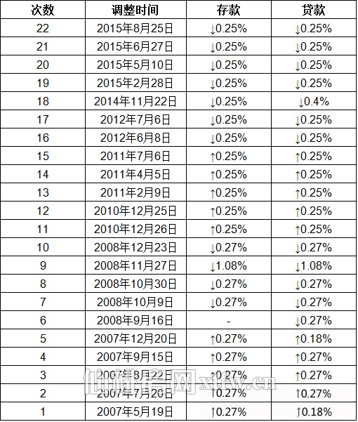 中国人民银行决定:自2015年8月26日起,下调金融机构人民币贷款和存款基准利率,以进一步降低企业融资成本。其中,金融机构一年期贷款基准利率下调0.25个百分点至4.6%;一年期存款基准利率下调0.25个百分点至1.75%;其他各档次贷款及存款基准利率、个人住房公积金存贷款利率相应调整。同时,放开一年期以上(不含一年期)定期存款的利率浮动上限,活期存款以及一年期以下定期存款的利率浮动上限不变。