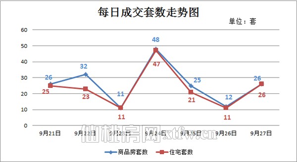仙桃房网新数据统计:2015年9月21日至2015年9月27日仙桃楼市销售总交易记录为180套,成交面积19758.9㎡,成交金额70794436.84元,均价约3582.91元/㎡。其中住宅成交164套,成交面积为18602.57㎡,成交金额约54300998.85元,成交均价约2919.01元/㎡;非住宅销售16套,成交面积1156.33㎡,成交金额约16493438元,成交均价约14263.61元/㎡。(此数据供参考,请以官方发布数据为准。)