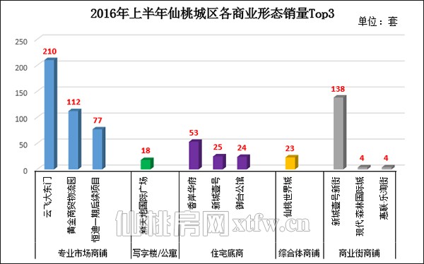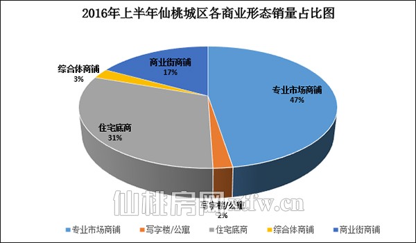 根据2016年上半年仙桃城区各商业形态销售占比图,我们可以看到上半年专业市场的商铺销售占比居,住宅底商的受欢迎程度也占幅较大。