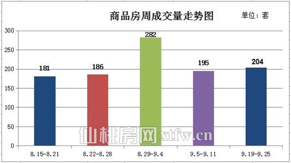 仙桃房网数据统计:2016年9月19日至2016年9月25日仙桃楼市销售总交易记录204套,成交面积22042.38㎡,成交金额77606668.27元,均价约3546.63元/㎡。其中住宅成交168套,成交面积为18935.11㎡,成交金额约62368728.49元,成交均价约3315.30元/㎡;非住宅销售36套,成交面积3107.27㎡,成交金额约15237939.78元,成交均价约4863.36元/㎡。(此数据供参考,请以官方发布数据为准。)