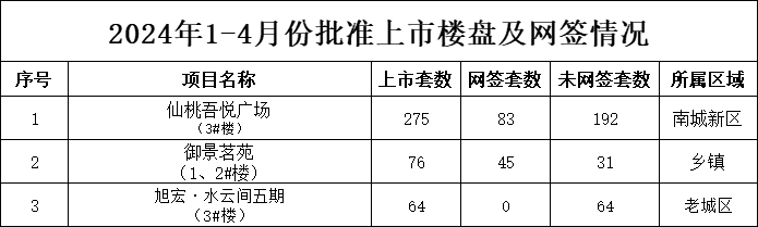 1-4月份新建商品房批准预售4.43万平方米(415套),同比减少76.6%,其中,商品住房4.12万平方米(376套),同比减少77%。