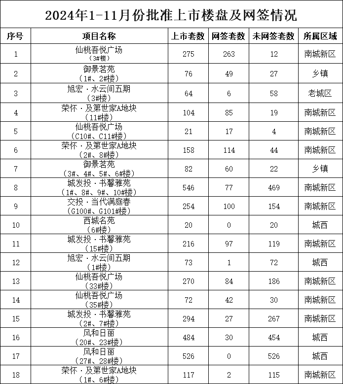 11月份新建商品房销售5.59万平方米(505套),同比增长94.1%;其中,新建商品住房销售5.44万平方米(478套),同比增长139%,商品住房成交均价5621元/平方米。