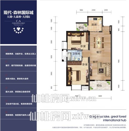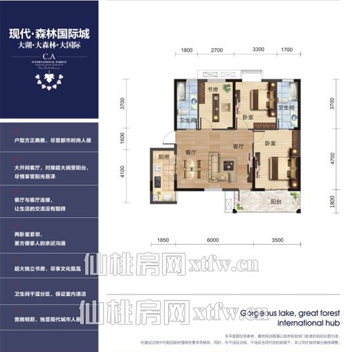 现代·森林国际城位于仙桃仙汉公路与朝阳路交汇处,将会借助仙台城南新区门户地段的核心优势,着力打造一个集科技、环保、健康为一体的大型综合体项目。项目把“大湖、大森林、大国际”作为未来规划和开发过程中的精神愿景,户型景观也遵循户户有景的原则,规划合理。