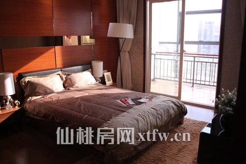 卧室和阳台之间用大大的落地窗隔开,视觉上仍是宽敞明亮,打开窗走到阳台是大湖美景。