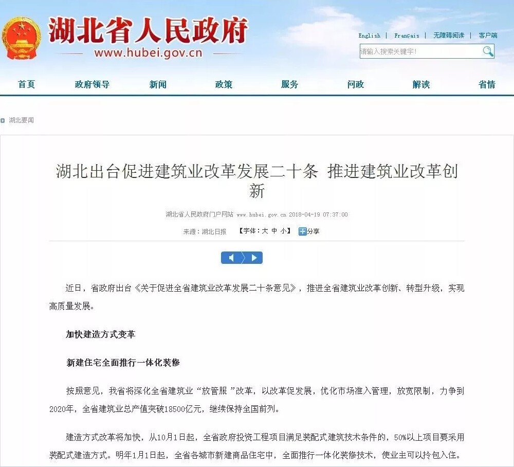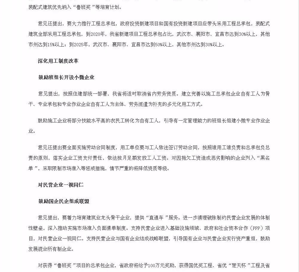 4月13日,湖北省人民政府网公开了《省人民政府关于促进全省建筑业改革发展二十条意见》(简称《意见》)。《意见》第4点“深化建造方式改革”中提出——