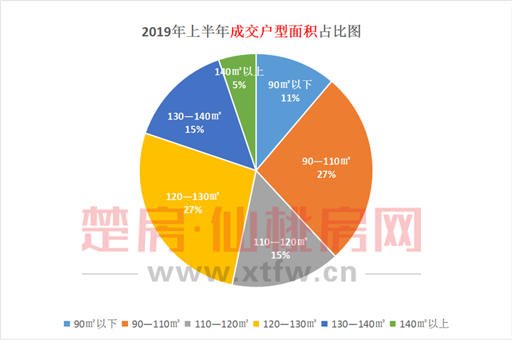 按照2019上半年销售房源的面积区间分段做出的数据统计显示,销量靠前的主要是90-110㎡/120-130㎡的户型,其次是110-120㎡/130-140㎡,90㎡以下和140㎡以上的成交量不多。充分说明了仙桃多数购房者依然是刚需或改善型刚需,选择三房/四房相较普遍。而目前市面上可选性的面积段也多为三房,尤其是90㎡以下的小户型,并不多见,还望意向小户型购房者把握时机。