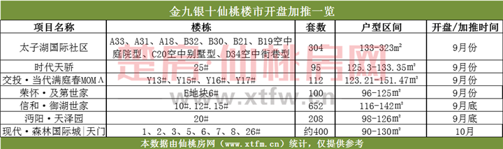 2020年9-10月仙桃有预计8大新盘推出,共计1800余套房源,抢占金九银十市场,供应量将迎来新一轮释放,值得购房者期待!