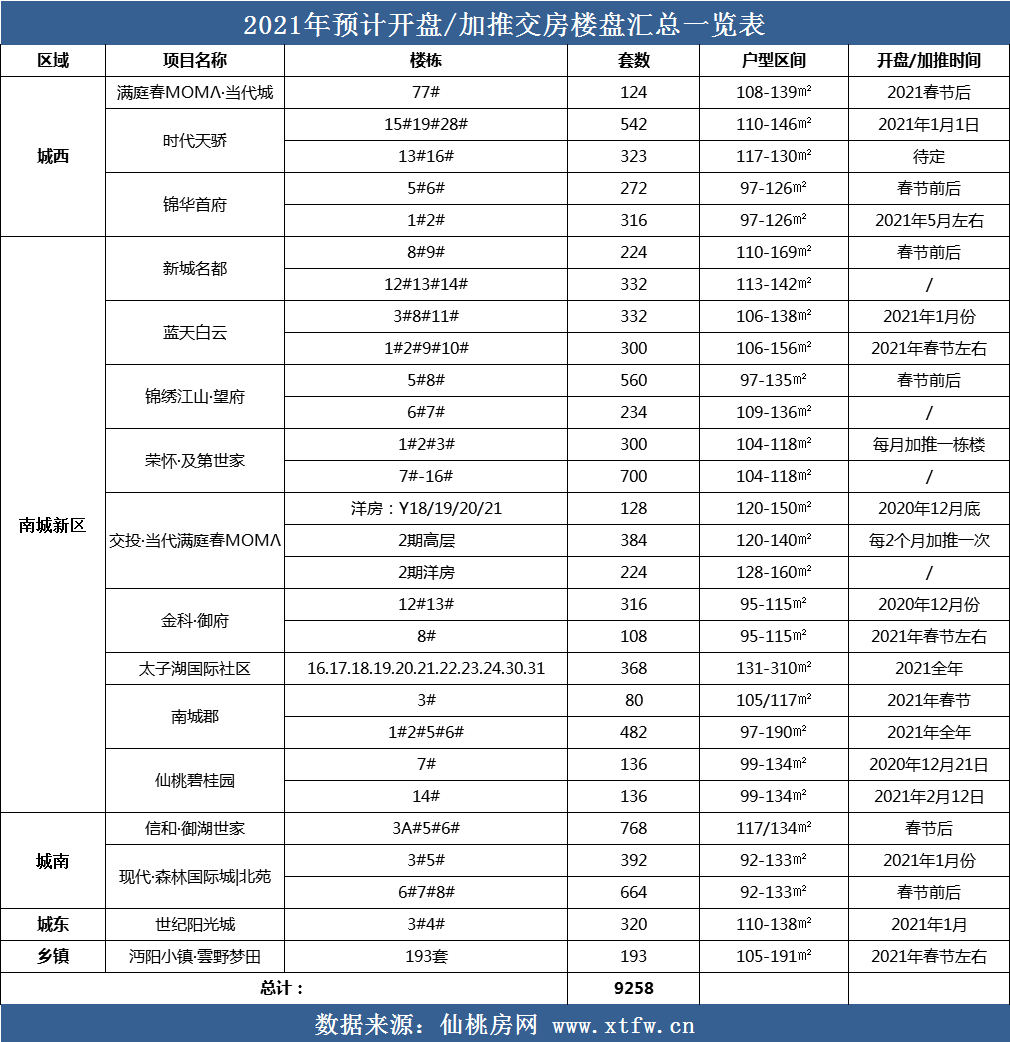 据仙桃房网不完全统计,2021仙桃预计共有个16楼盘新开或加推,开盘较多的区域为南城新区和城西版块,包含小高层、高层、别墅等多个产品类型。